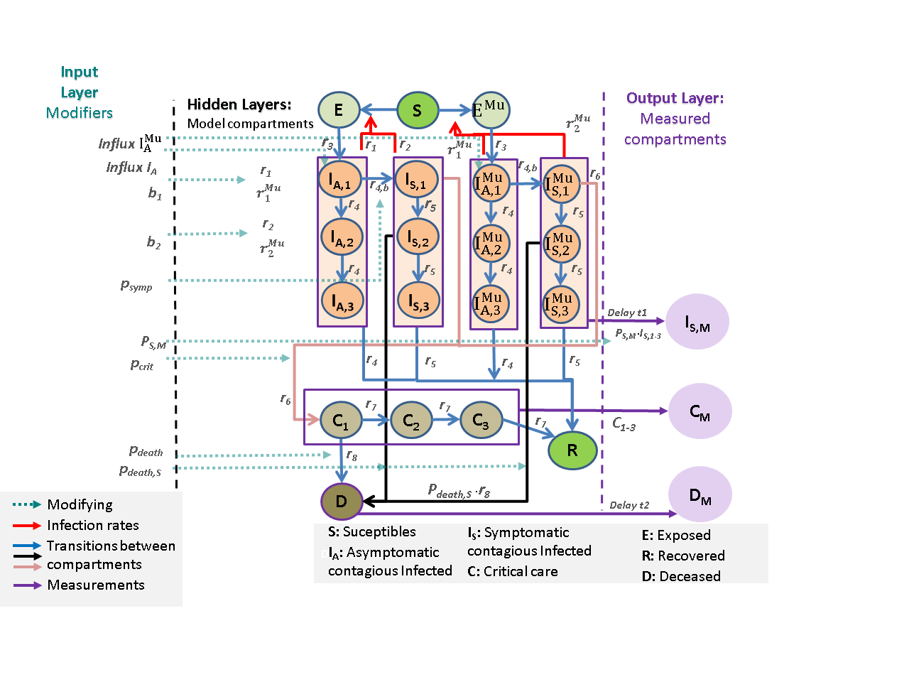 A principled approach to parametrize SIR-type epidemiologic models of different complexities by embedding the model structure as a hidden layer into a general Input-Output Non-Linear Dynamical System (IO-NLDS). Non-explicitly modelled impacts on the system are imposed as inputs of the system. Observable data are coupled to hidden states of the model by appropriate data models considering possible biases of the data. We estimate model parameters including their time-dependence by a Bayesian knowledge synthesis process considering parameter ranges derived from external studies as prior information. We applied this approach on a SIR-type model and data of Germany and Saxony demonstrating good prediction performances.